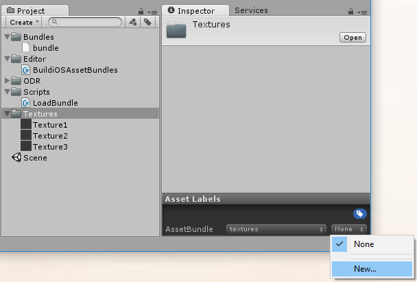 在此示例中,为 Textures 文件夹赋予了标签 textures。在 Editor 文件夹中创建了新脚本 BuildiOSAssetBundles.cs