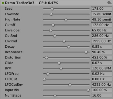 是时候进行一些有趣的练习了。为何仅仅处理声音而不使用插件系统来生成声音呢?让我们尝试做一些简单的低音和鼓合成器(喜欢听迷幻风格的人应该很熟悉),这是用于定义这种音乐流派的部分主要合成器的简单克隆。请看一下 Plugin_TeeBee.cpp 和 Plugin_TeeDee.cpp。这些简单的合成器只生成带有随机音符的图谱,并具有一些参数可用于在合成引擎中调整滤波器、包络等。同样,我们不会在这里讨论这些细节,仅指出在 ProcessCallback 中读取 state->dsptick 参数来确定“song”中的位置。此计数器是一个全局样本位置,因此我们只需将其除以样本中指定的每个音符的长度,并在该除法的余数为零时向合成引擎触发音符事件。这样,所有插件效果都与同一个基于样本的时钟保持同步,如果您想通过这样的效果播放具有已知节拍的预录制音乐,则可以使用该时序信息来对音乐应用节拍同步的滤波器效果或延迟。