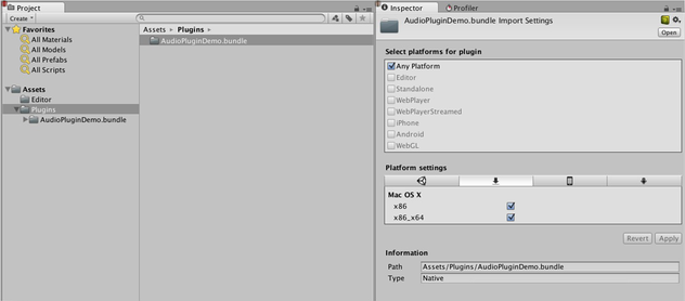 原生音频插件使用与其他原生或托管插件相同的方案,因为它们都必须通过插件导入器检视面板与其各自的平台相关联。您可以在这里进一步了解用于放置插件的子文件夹。必须进行平台关联,这样系统才能知道在独立构建中每个构建目标上要包含哪些插件,并且随着 64 位支持的引入,甚至必须在平台内指定平台关联。OSX 插件在这方面具有特殊性,因为通用二进制格式允许 OSX 插件在同一个 Bundle 中包含 32 位和 64 位变体。