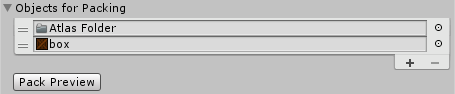 Objects for Packing 列表显示精灵图集中当前选定的项。可以将 Texture2D 和精灵资源放入此列表中。将文件夹直接拖放到列表中,即可自动将文件夹中的所有有效内容添加到列表中(仅文件夹显示在列表中)。
