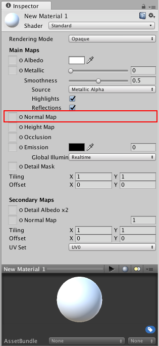 在资源中放入法线贴图后,可将其放入检视面板中的材质 Normal Map 字段。标准着色器有一个 Normal Map 字段,许多较旧的旧版着色器也支持法线贴图。