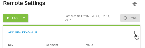 1.导航至 Unity Analytics Dashboard 上的 Remote Settings 页面。 2.选择要导出的配置(__Release__ 或 __Development__)。 3.单击列表标题右侧的菜单图标: