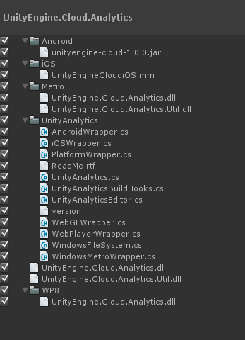 在 Project 文件夹中找到现有的 Unity Analytics SDK 组件。它们最有可能保存在 Assets > Plugins。务必仅选择特定于 Analytics 的资源。