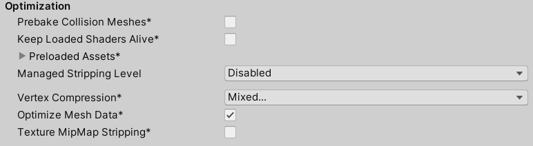 | Texture MipMap Stripping | Enable this option to enable mipmap stripping for all platforms, which strips unused mipmaps from Textures at build time. Unity determines unused mipmaps by comparing the value of the mipmap against the Quality Settings for the current platform. If a mipmap value is excluded from every Quality Setting for the current platform, then Unity strips those mipmaps from the build at build time. If QualitySettings.masterTextureLimit is set to a mipmap value that has been stripped, Unity will set the value to the closest mipmap value that has not been stripped. | |