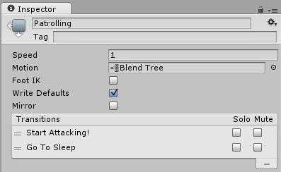 例如,您的角色可能具有“巡逻”状态和“睡眠”状态。您可以将巡逻和睡眠之间的过渡设置为仅在“alertness”参数值低于某个水平时才会发生。