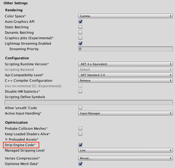 打开 Other Settings 访问 Strip Engine Code 选项。默认情况下会选中此选项以启用 WebGL 的代码剥离。选中此选项后,Unity 不会包含未使用的任何类的代码。例如,如果不使用任何物理组件或函数,则会从构建中删除整个物理引擎。有关更多详细信息,请参阅下面的“剥离”部分。