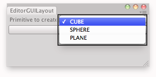 void OnGUI() { op = (OPTIONS)EditorGUILayout.EnumPopup("Primitive to create:", op); if (GUILayout.Button("Create")) InstantiatePrimitive(op); }