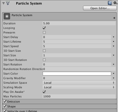 粒子系统的常规参数保存在一个特殊的主模块中。在 Inspector 中,这些参数显示在所有其他模块上方: