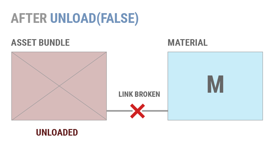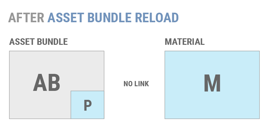 如果稍后再次加载 AB 并且调用 AB.LoadAsset(),则 Unity 不会将现有 M 副本重新链接到新加载的材质。
