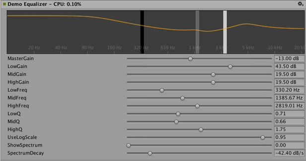 我们不会在这里讨论均衡器插件和多频段插件中将要进行的 DSP 处理的细节,对于感兴趣的用户,请知悉这些滤波器取自于 Robert Bristow Johnson 的杰作:Audio EQ Cookbook(音频均衡器说明书),而为了绘制曲线,Unity 还提供了一些内部 API 函数来为频率响应绘制抗锯齿曲线。