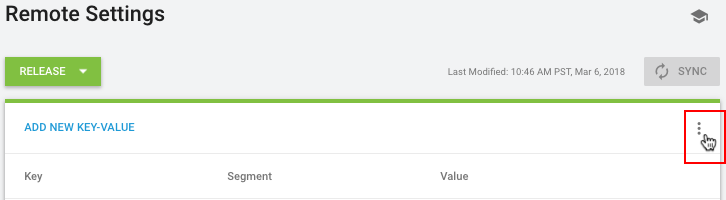 1.导航至 Unity Analytics Dashboard 上的 Remote Settings 页面。 2.选择要导出的配置(__Release__ 或 __Development__)。 3.单击列表标题右侧的菜单图标: