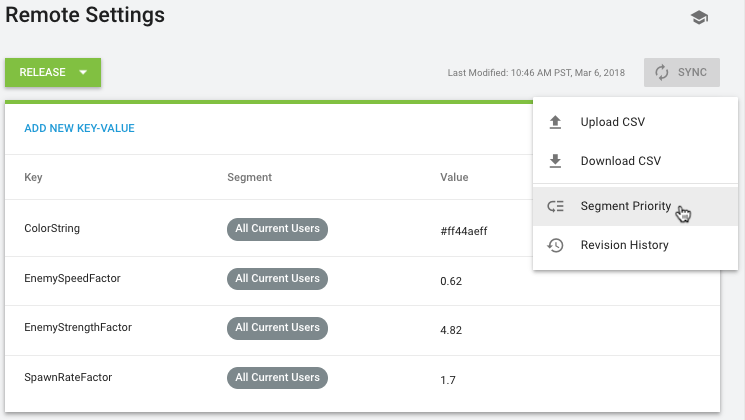 当一个玩家是多个细分段的成员时,Unity会将值发送给最高优先级的细分段。(如果一个设置没有任何细分值,或者玩家不是含有一个键对应多个值的细分段的成员,Unity会发送All Users值。)你可以设置细分段的顺序来指定当存在重叠时应该优先哪个细分值。