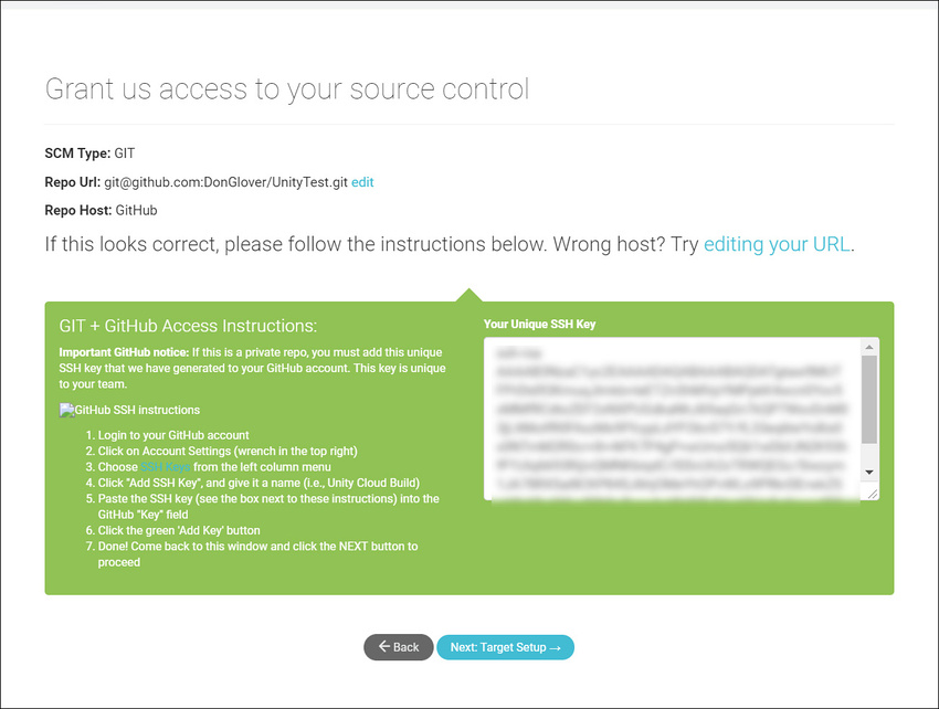 7.将来自 Grant us access to your source control 窗口的 Unity Cloud Build SSH 密钥粘贴到 Key 字段中。