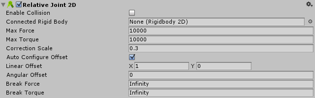 FixedJoint2D 是一种弹簧式关节。RelativeJoint2D 是具有最大力和/或扭矩的电机型关节。
