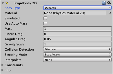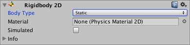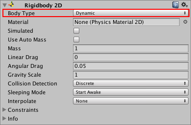 2D 刚体组件在顶部有一个显示为 Body Type 的设置。在此设置中选择的选项会影响组件上可用的其他设置。
