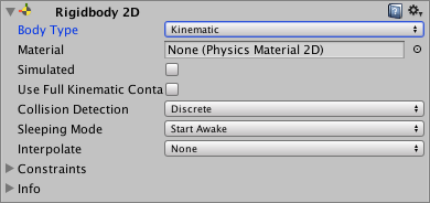 Body Type 设置 2D 刚体的组件设置,从而可操纵移动(位置和旋转)行为和 2D 碰撞体交互。