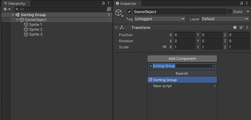 To place a GameObject into a Sorting Group, add the Sorting Group component to it. To do this, select the GameObject and go to Component > Rendering > Sorting Group, or select the Add Component button in the Inspector window of the GameObject.