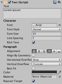 文本控件提供字体大小、样式以及文本对齐方式等常用参数。启用 Rich Text 选项后,文本中的标记元素将视为样式信息,因此可仅让单个单词或短段使用粗体或不同颜色,等等(请参阅有关富文本的页面以获取有关标记方案的详细信息)。