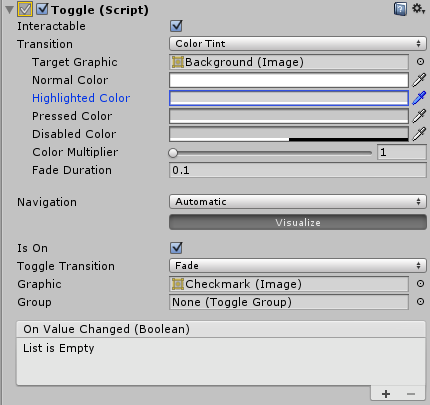| On Value Changed | 单击开关时调用的 UnityEvent。该事件可将当前状态作为 bool 类型动态参数发送。 |