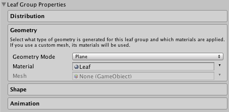 选择为此树叶组生成的几何体类型以及应用的材质。如果使用自定义网格,则会使用其材质。