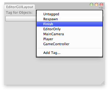 void OnGUI() { tagStr = EditorGUILayout.TagField("Tag for Objects:", tagStr); if (GUILayout.Button("Set Tag!")) { SetTags(); } }