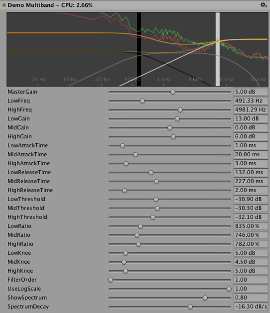 至此,我们还要指出的是,均衡器效果和多频段效果都是有意保持简单并且未进行优化,但我们认为它们是插件系统支持的更复杂 UI 的参考典范。显然还需要执行大量工作来进行特定于平台的相关优化,并执行大量参数调整以使其真正合理并以最具音乐性的方式响应,等等。我们也可能在某些时候在 Unity 中将上述其中某些效果作为内置插件实现,这样做只是为了方便增加 Unity 的标准插件库,但我们真诚希望读者也能接受挑战,制作一些非常棒的插件,说不定它们以后可能变为内置插件。;-)