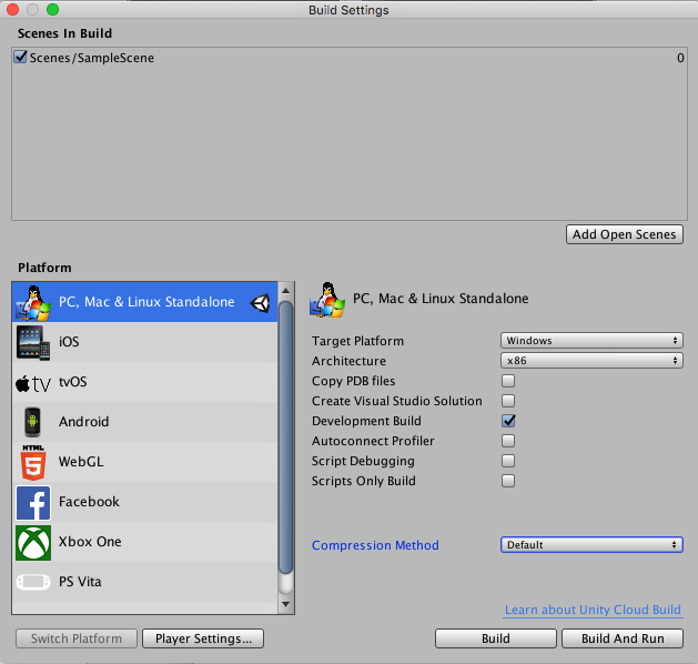 1. Go to File > Build Settings, and under Platform, select Windows, Mac, Linux. Set the Target Platform to Windows, set the Architecture to Intel 64-bit, and click the Development Build checkbox.