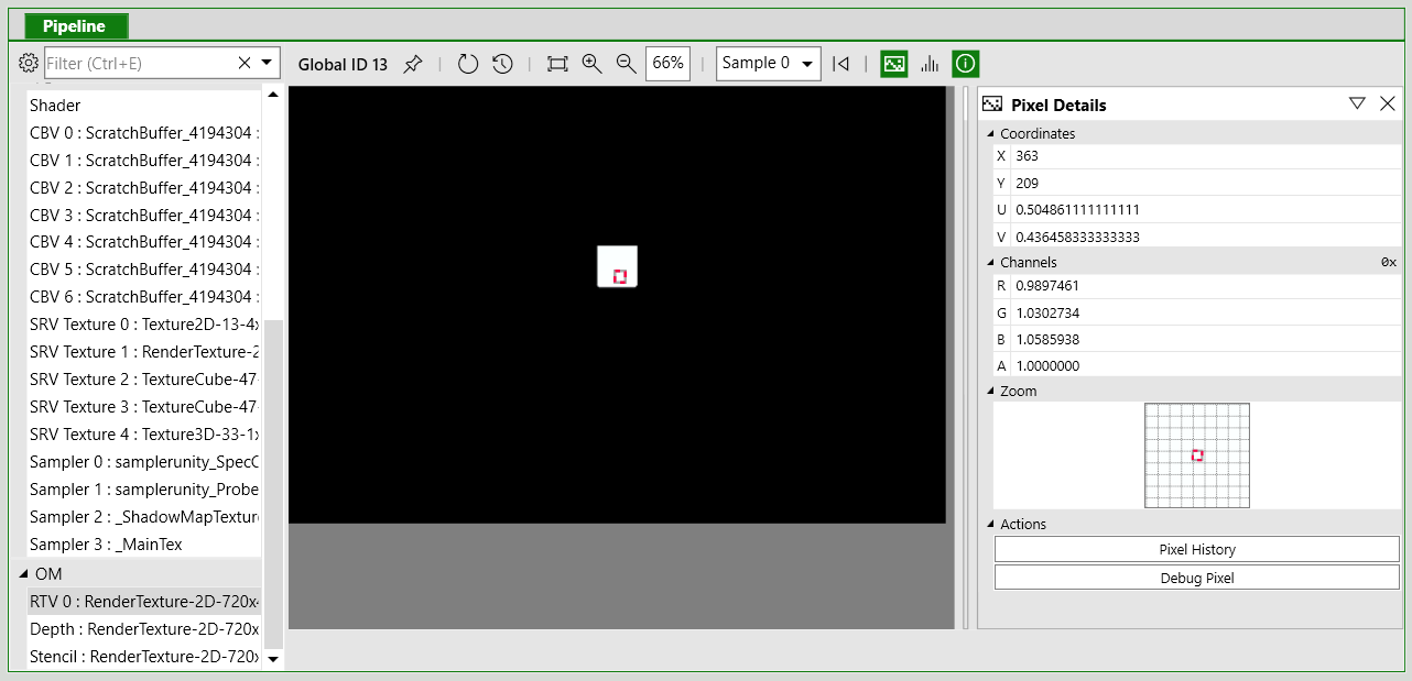11. Pipeline 选项卡的下半部分,从 OM (Output Merger) 列表中选择一个渲染目标以查看绘制调用的输出。在要调试的对象上选择一个像素。请注意,为了查找感兴趣的绘制调用,一种方法是可以右键单击像素以查看绘制调用历史记录。