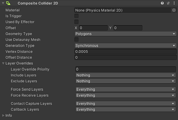| Synchronous | Select this to have Unity immediately generate new geometry when a change is made to the Composite Collider 2D or to any of the Colliders composing it. | |
