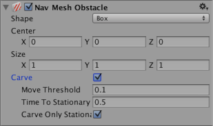 To enable this mode, untick the NavMesh obstacle component’s Carve Only Stationary checkbox. When this is unticked, the carved hole is updated when the obstacle has moved more than the distance set by Carving Move Threshold. This mode is useful for large, slowly moving obstacles (for example, a tank that is being avoided by infantry).