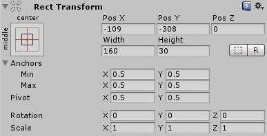 Left, Top, Right, Bottom 矩形边缘相对于锚点的位置。可视为由锚点定义的矩形内的填充。当锚点分离时(见下文)将取代 PosWidth/Height 显示。要访问这些选项,请单击 RectTransform 组件左上方的 Anchor Presets 方框。