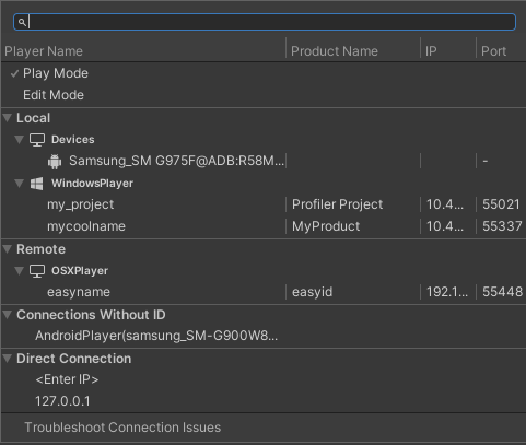 | Local | This list contains any device that is running on the local machine, in the Unity Editor or in a standalone player. It also displays information for players that are physically connected to the host machine with a cable. |