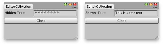 void OnGUI() { // Show the contents if (EditorGUI.actionKey) { text = EditorGUI.TextField(new Rect(0, 5, 245, 20), "Shown Text:", text); } else { // show the pasword field text = EditorGUI.PasswordField(new Rect(0, 5, 245, 20), "Hidden Text:", text); } if (GUI.Button(new Rect(0, 30, 250, 20), "Close")) this.Close(); }