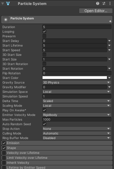 粒子系统的常规参数保存在一个特殊的主模块中。在 Inspector 中,这些参数显示在所有其他模块上方: