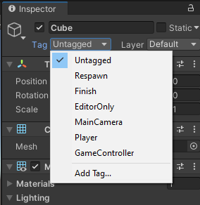 The Inspector shows the Tag and Layer dropdown menus just below the name of a GameObject. To apply an existing tag to a GameObject, open the Tags dropdown and choose the tag you want to apply. The GameObject is now associated with this tag.