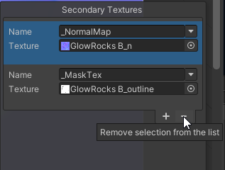 To delete a Secondary Texture, select it from the list and then select - at the bottom right of the window. This automatically removes the entry.