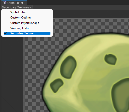 To preview the Secondary Texture in the Sprite Editor window, select an entry in the list. This automatically hides the Sprite’s main Texture. Click outside of the Secondary Textures list to deselect the entry, and the main Sprite Texture becomes visible again.
