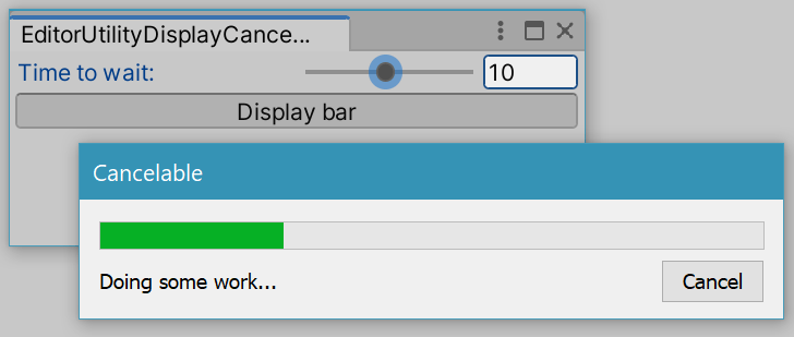 void OnGUI() { secs = EditorGUILayout.Slider("Time to wait:", secs, 1.0f, 20.0f); if (GUILayout.Button("Display bar")) { var step = 0.1f; for (float t = 0; t < secs; t += step) { if (EditorUtility.DisplayCancelableProgressBar("Cancelable", "Doing some work...", t / secs)) break; // Normally, some computation happens here. // This example uses Sleep. Thread.Sleep((int)(step * 1000.0f)); } EditorUtility.ClearProgressBar(); } } }