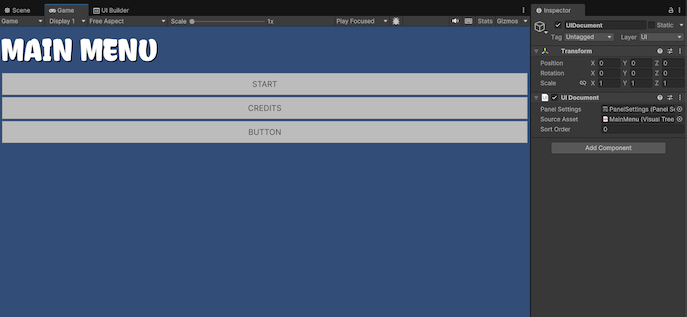 Add this component to a GameObject using the Add Component menu in the Inspector, or right-click in the Hierarchy and select UI Toolkit > UI Document, which will automatically assign the Panel Settings asset.