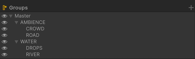 Connected groups in the mixer form a path from the mixer's master group to the leaves. This path has the format Master Group/Child of Master Group/Grandchild of Master Group, and so on. For example, in the hierarchy below, the group DROPS has the path Master/WATER/DROPS. To return only the group called DROPS, enter DROPS. The substring Master/AMBIENCE returns three groups, AMBIENCE/CROWD, AMBIENCE/ROAD, and AMBIENCE. The substring /R would return both ROAD and RIVER.
