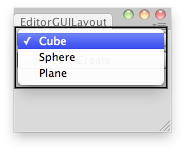 void OnGUI() { index = EditorGUILayout.Popup(index, options); if (GUILayout.Button("Create")) InstantiatePrimitive(); }