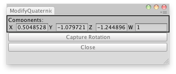 void OnGUI() { value = EditorGUILayout.Vector4Field("Components:", value); if (GUILayout.Button("Capture Rotation")) value = QuaternionToVector4(Selection.activeTransform.rotation);