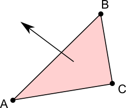 In the previous image a triangle is defined by points A in the bottom left, B at the top, and C at the bottom right. An arrow indicates the plane this triangle lies on as facing towards the viewer.